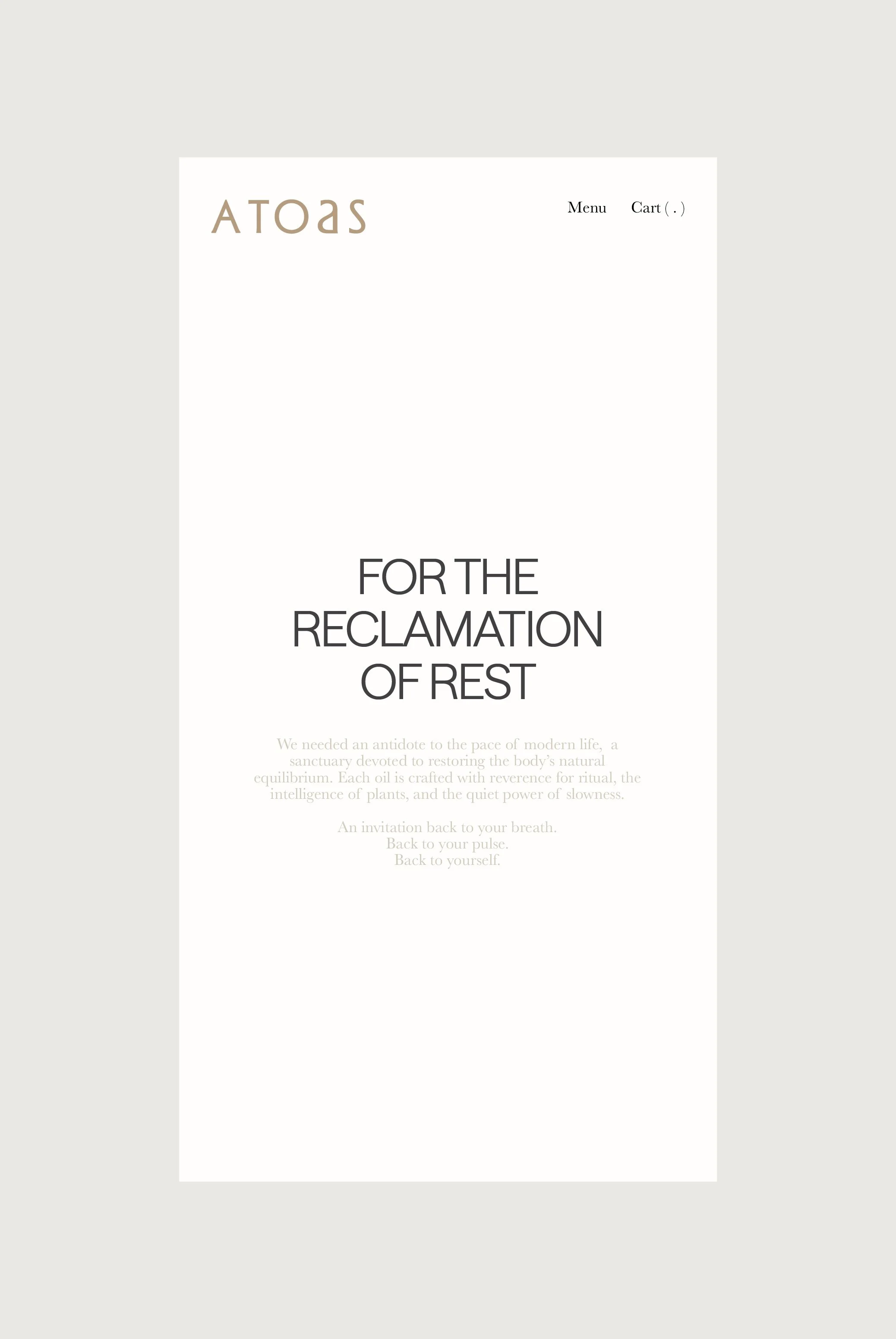 Atoas emerged from the reclamation of slowness. A modern apothecary built around the rituals of sleep, dream, and nervous system repair. The founder envisioned a world where rest is not an afterthought but a right, tended to with tenderness, design, and devotion. As the brand moved beyond concept and into form, it needed a visual and structural world that could hold its depth: elemental, restrained, and sensorial.