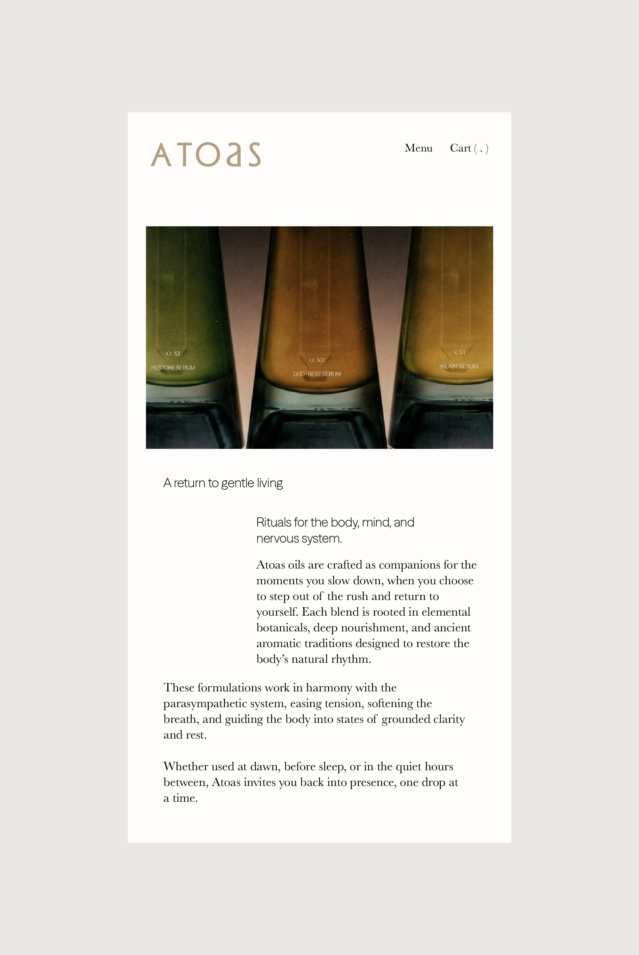 Serums appear as small monoliths of rest, organized through pathways like Sleep, Dream, and Nervous System Reset. The interface blends clarity with atmosphere, allowing the bottles, textures, and subtle color shifts to hold the emotional weight of the brand. The result is a digital home that mirrors the Atoas ethos: spacious, intentional, and devoted to the reclamation of rest.