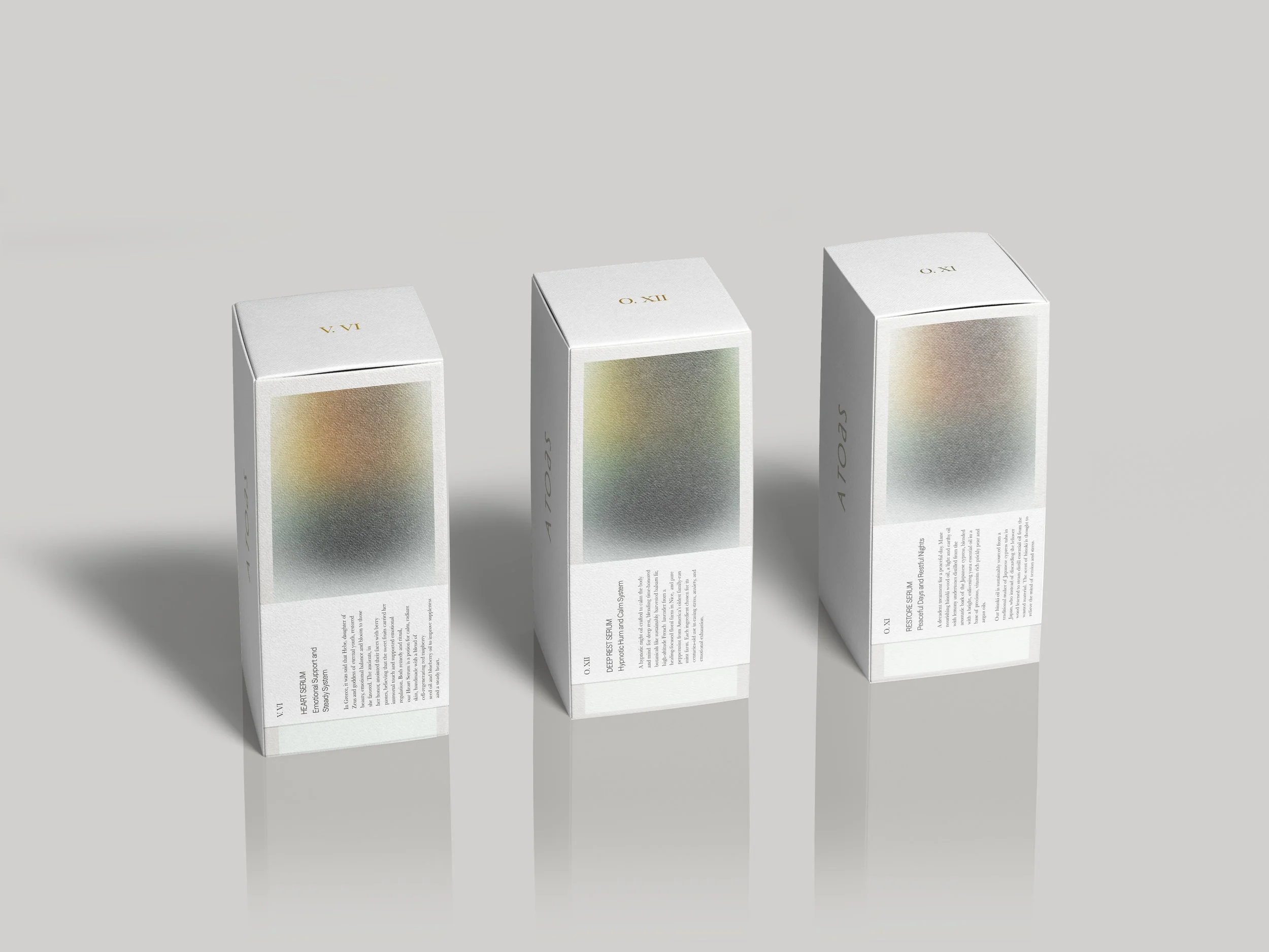 The packaging system was designed to feel like an exhale. Soft gradients echo the hypnotic tones of the oils inside, creating a visual transition from wakefulness to rest. Each box acts as an entry point into the ritual, minimal in structure yet atmospheric in presence. The goal was to build a sensory quietude before the product is even opened.