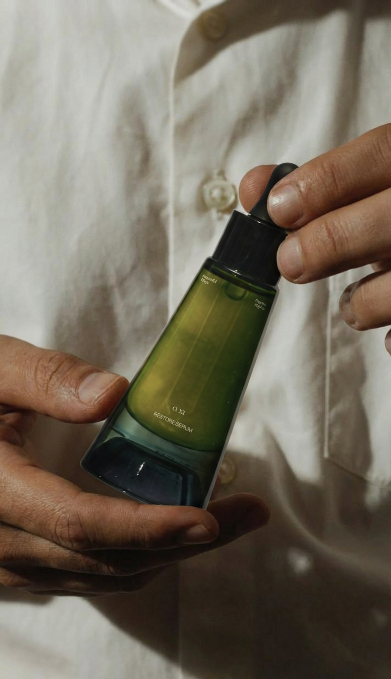 The vessels themselves are expressed as a chromatic spectrum, shifting from deep greens to warm ambers. Each tone corresponds to a distinct emotional state and botanical profile, allowing the collection to communicate intuitively through color. The result is a system that feels modern, ceremonial, and deeply grounded in the body’s natural rhythms.